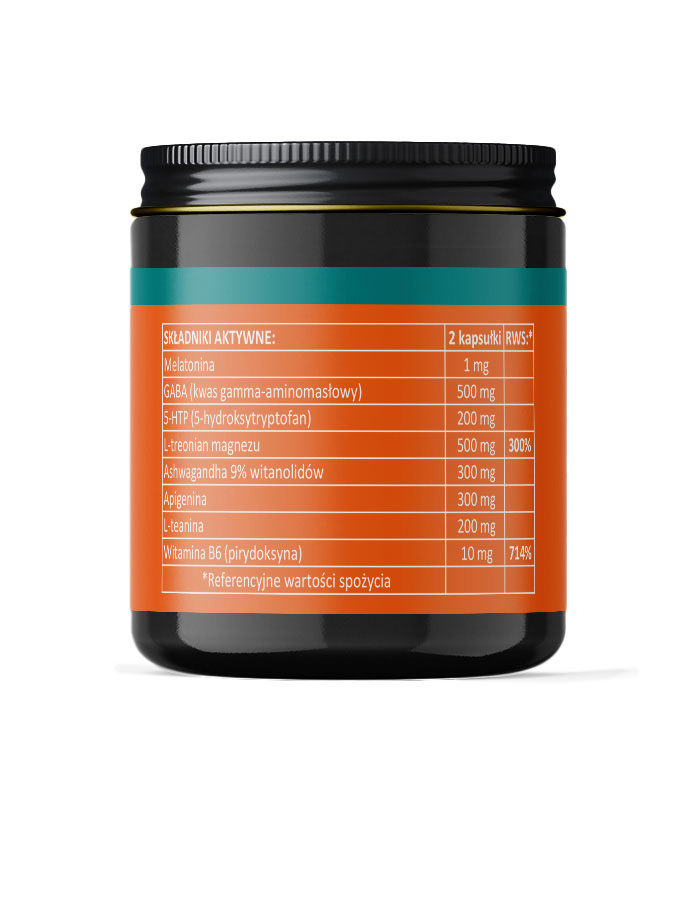 Suplement diety opracowany z myślą o osobach poszukujących naturalnego wsparcia w relaksacji i wyciszeniu. Zawiera melatoninę, GABA, 5-HTP, ekstrakt z ashwagandhy oraz magnez w formie L-treonianu – składniki te są często stosowane w kontekście wieczornego wyciszenia, komfortu psychicznego i prawidłowego funkcjonowania układu nerwowego. Uzupełniony o witaminę B6, apigeninę i l-teaninę, preparat wspiera codzienną równowagę organizmu.